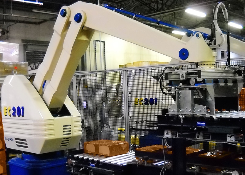 PeakLogix designed and installed an automated conveyor system to feed cases into and transport pallets out of 4 Fuji Robotic Palletizers, integrating robots and custom-built end effectors.